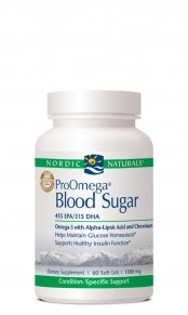 Nordic Naturals - ProOmega Blood Sugar 60sg. High Concentrate EPA/DHA Formula with Alpha-Lipoic Acid and ChromiumPharmaceutical GradeMolecularly DistilledNordic Naturals ProOmega Blood Sugar contains a synergistic blend of highly concentrated omega-3 fatty acids, Chromium, and Alpha-Lipoic Acid to support healthy blood sugar levels, body weight, and metabolism.* ProOmega Blood Sugar helps maintain healthy triglyceride levels, support normal insulin function, promote fat metabolism, and provide antioxidant protection. *All Nordic Naturals fish oils surpass all pharmaceutical standards for freshness and purity. Every batch is third-party tested, showing no detected levels of heavy metals, dioxins, or PCBs.*These statements have not been evaluated by the Food and Drug Administration. This product is not intended to diagnose, treat, cure, or prevent any disease.Nordic Naturals ProOmega Blood Sugar - 60 caps Features.